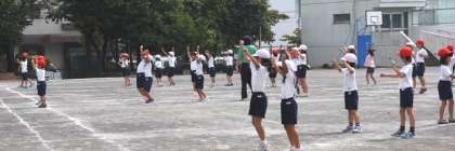 21日、1・2年生の運動会練習のようすです。この日も日差しが強く暑い校庭で、それでも元気に演技種目の練習に汗を流しました。