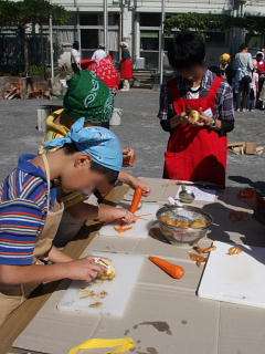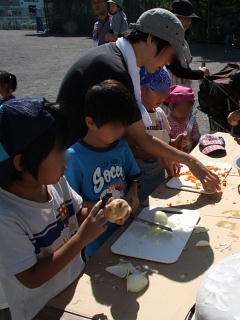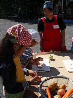 7つの班に分かれてカレーライスに使う野菜の調理。ピーラーと包丁を使ってがんばります。ちょっとあぶなっかしい手つきですが・・・見守られながらがんばります。よい経験ですね。
