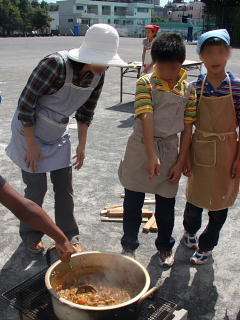 カレーの鍋をのぞき込みながら、肉を入れたり、煮込んだり、かき混ぜたり。そして最後にカレーのルーを入れてできあがり。おいしそうなカレーの香りがあたりにただよいます。それにしてもかまどの近くは熱いし煙いし大変です。でもみんな楽しそうでしょう。