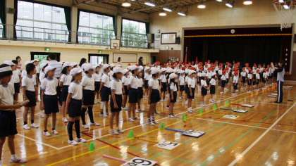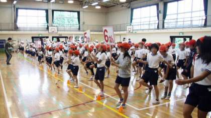 28日(火)1校時、10月2日の運動会に備えて、全体練習を行いました。ところが、今週末が運動会だというのに昨日も今日もはげしい雨で、校庭を使った練習ができません。今日は体育館で開会式と応援の練習をしました。最初に運動会の歌をみんなで歌いました。1回目はちょっと元気がなかったのですが、担当から励まされて、2回目は大きな声が出ました。続いて準備体操の練習。体育委員会の子どもたちがこの日に備えて練習してきたラジオ体操第一を前で披露し、みんながそれにあわせて体操しました。前半の最後に、入場行進の音楽に合わせて足踏みの練習をしました。外で練習できなかったのが残念です。