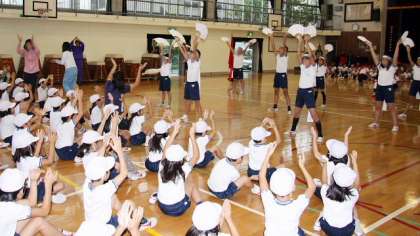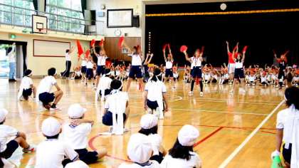 後半は応援の練習です。この日にむけて練習を積んできた応援団のみんなへの初お披露目です。応援団の気迫に応えるように、子どもたちは元気に声を張り上げ練習しました。