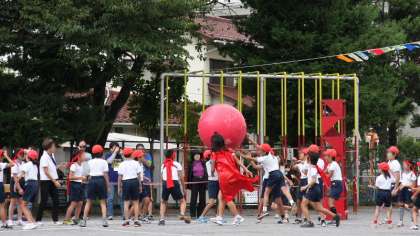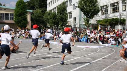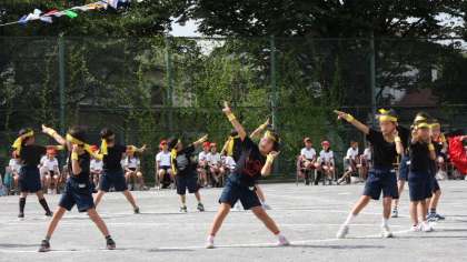 最初の得点種目、「ゴールめざして(大玉送り)」では赤の勝利。個人走は1・2年が50m、3・4年が80m、5・6年が100mで競い、スタート前には一人一人の名前が読み上げられ拍手がわき起こります。声援に応えて精一杯走る子供たち。演技種目は2学年が組んで練習の成果を披露しました。1・2年生がその先陣をきり、「ザ・ニンジャ」を力いっぱい演じ、会場は大歓声にわきました。
