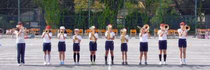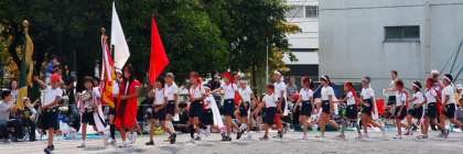 9時、音楽クラブの金管楽器によるファンファーレで入場行進開始。応援団を先頭に堂々の行進です。姿勢がいいですね。