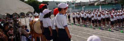 開会式。優勝旗(赤)、準優勝杯(白)返還。今年はどちらの手に?児童代表の言葉は1年生の4人。みんなしっかりとした話し方で決意を述べました。応援団長による選手宣誓。