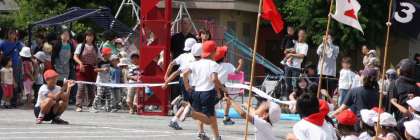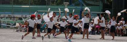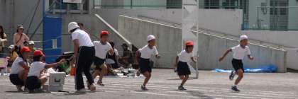 2年生50m走。校庭の中央に引かれた50mのトラックは、児童応援席の真ん前。応援にも熱が入ります。颯爽と駆け抜ける子どもたち。ゴールし終わった子どもたちの声援もとびます。
