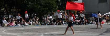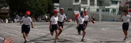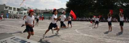 6年100m走。運動会で5・6年生は競技に係の仕事にと大忙し。それでも見てください、この走る姿。力いっぱい小学校生活最後の運動会にがんばります。5年生応援団がその姿に力いっぱい応援しています。