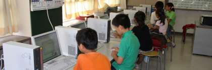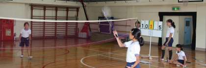 クラブ活動の紹介。上がパソコンクラブ。この日は「秋」をテーマにデザインをしていました。下はバドミントンクラブ。試合のようすです。もう一つ、料理・手芸クラブは残念ながら取材が時間切れでできませんでした。4・5・6年生が楽しく活動しているようすを、感じていただけましたか?