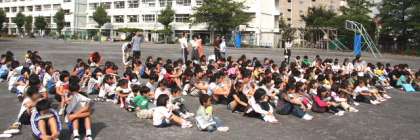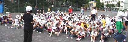 13日(水)、9時50分から避難訓練を行いました。大地震発生、その後火事という設定で実施しました。今日は、区の防災担当にお願いしてスモークマシンで階段に煙を充満させての訓練を行いました。みんな口にマスクをあてて整然と避難できました。