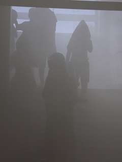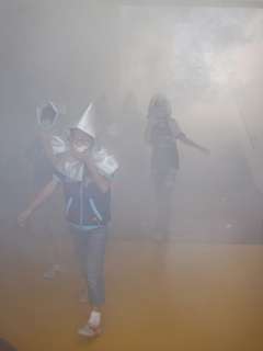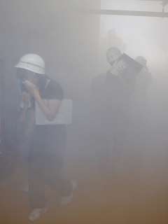 煙が充満した階段を避難する子どもたちのようすです。訓練に使う煙は無害のものを使用していますが、視界が悪く、立ちこめる煙に子どもたちは真剣です。万が一に備え、よい体験ができました。