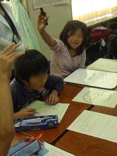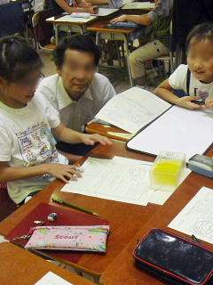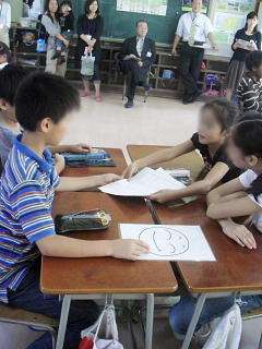 活発な意見交流をしている授業の様子です。担任は各班を回り話し合いをサポート。本校教員は手分けして子どもたちの発言を記録します。