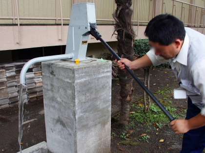 学校西側、体育館横に、震災発生時に本校が避難所となり、その際使われるマンホールトイレに水を流すための井戸が設置されました。今日は設置業者が来校して、試運転が行われました。結果は上々です。23日(土)午後に、「避難所体験訓練」が行われ、万が一に備えた実践的な訓練を行います。その際にも井戸の使用体験ができますので、ぜひご参加下さい。