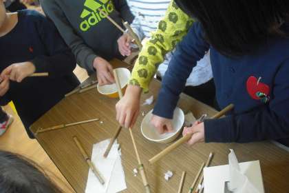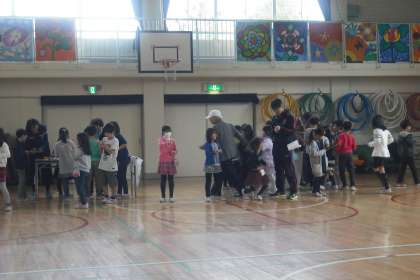 地域の方々が昔遊びを教えてくださいました。コマ回し、竹鉄砲等を教えていただきました。みんな楽しそうに遊んでいました。