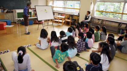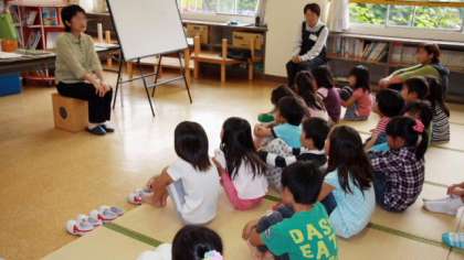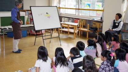 15日(金)、船橋図書館の方々をお招きして、絵本の部屋で「お話会」を行いました。いつもの読み聞かせとはまた違った雰囲気に、子どもたちは真剣に聞き入っていました。
