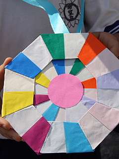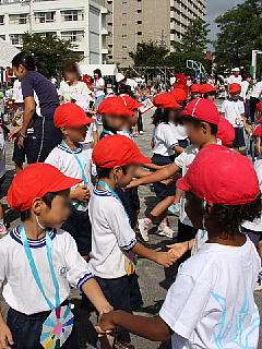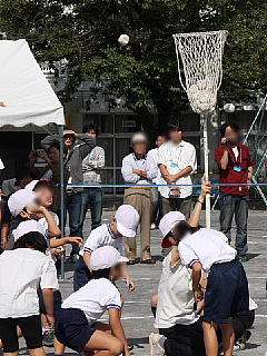 玉入れは保育園年長さんと一緒にやりました。終わった後、大きな手作りのメダルをいただき、うれしそうな1年生です。
