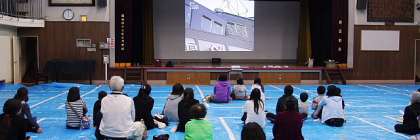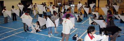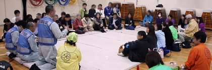 夕方、炊き出し訓練でできあがったアルファ米と各自持ち寄ったおかず、そして今回は宇ウィンナーソーセージをたき火で焼いて、夕食にしました。日もとっぷりと暮れた頃、体育館に集まりブルーシートをしき避難所設営。その後、阪神淡路大震災のビデオを見て、赤十字の皆さんによる応急手当の実習、最後に参加者によるディスカッションというように、有意義な訓練ができました。