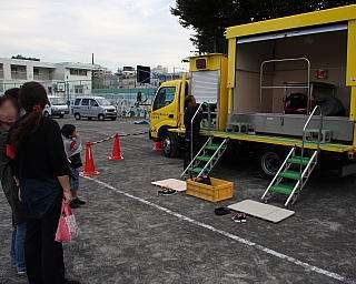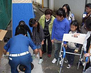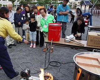 今年度設置された「マンホールトイレ」の使い方を教えてもらい、さらに上に設置するテントの設営訓練をしました。起震車では、震度7の体験をして、冷静に対応することの大切さを学びました。そのほかにも避難所設営のための様々な道具の使い方についてレクチャーを受けました。写真はバーナーの使い方です。