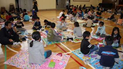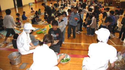希望っ子班集会に続いて、班で給食を食べました。各自がもってきたお弁当箱に給食をつめて、希望っ子班ごとに場所を決めて一緒に食べました。晴れていれば、校庭で食べるはずだったのですが、残念ながら体育館で食べました。元気のよい希望っ子たちは、食欲も旺盛。調理主事さんが盛りつけをしてくれているおかわりコーナーには長蛇の列でした。