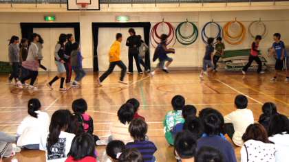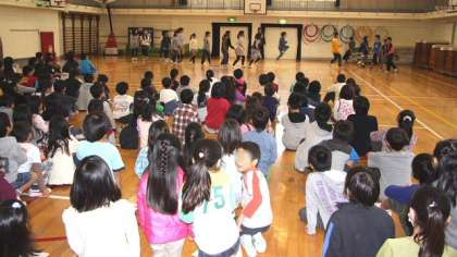 11月1日(月)、朝会で6年生が連合運動会の報告と、その際に取り組んだ長なわ跳びを1年生から5年生に披露しました。がんばった6年生に、「すごい」「かっこいい」の声が。6年生がよい手本になることはすばらしいことですね。