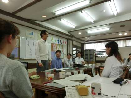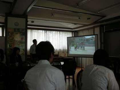 雨天のため、今までの授業や、本日行う予定の授業の他クラスの実践の様子を撮影したビデオを見ながら協議会を行いました。