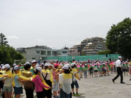 子どもも職員も、色とりどりのエプロンを広げ、人文字を作りました。
