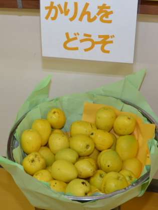 校庭の果樹から収穫した果実をおわけしています。甘酸っぱい香りを漂わせている「カリン」は主事室前で、来校された方に自由にお持ちいただいています。そのまま食べることはできませんが、蜂蜜や焼酎につけると美味しく食べられます。色鮮やかな「柿」も次々と収穫されています。エコに協力してくれた子どもたちに賞品として配っています。