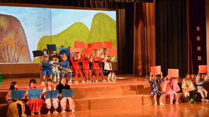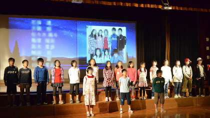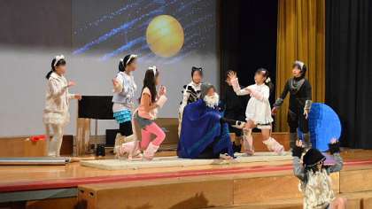 さて、写真は18日に行われたリハーサルの様子です。今年度は舞台後方の壁にプロジェクターで画像を映し出して背景として使用しています。壁一面に美しい情景が展開され、その前で一生懸命演技する子どもたちを引き立たせます。ぜひご覧ください。