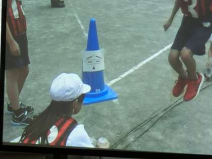 雨天のため、授業は行えませんでしたが、事前に撮影された映像を見ながら協議を行いました。