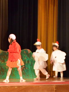 1年生 劇「そらとぶにわとり」です。空を飛んでみたいニワトリたちが旅に出ます。どんな結末に・・・元気でかわいい1年生が力いっぱい演じます。