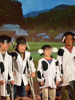 本校唯一2学級ある3年生 劇「わっしょい わっしょい ぶんぶんぶん」に挑戦です。かこさとしさんの絵本が原作です。音楽を楽しむ人間や動物たちと、悪魔の戦い。勝利はどちらに? 3年生らしいはつらつとした動きでがんばります。