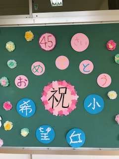 今年度は、開校45周年なので、図書館でも、開校を祝った掲示の工夫をしています。