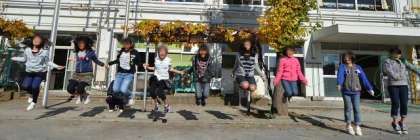 今週はなわとびの新しい技に挑戦。そのなかで、6年生女子が集まっておもしろい技に挑戦していました。横一直線にならんで隣の人の縄をもち、一斉に跳びます。最初は5人でやっていましたが、しばらくたってもう一度見ると9人になっていました。仲良しで息もぴったりで楽しそうでした。