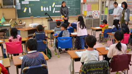 12月1日、給食後2年生から6年生が下校した後、1年生の研究授業を行いました。教科は算数。「おおきさくらべ」という学習で、今日はその中でも「水のかさ」について考える場面です。最初は学習室でグループごとに、もちよった水筒のかさを比べる方法を試しました。その後教室でやってみた結果をみんなに発表し、一緒に考えました。実験をする姿も、発言する姿や発言の内容もすばらしく、しっかり考えて学習していました。