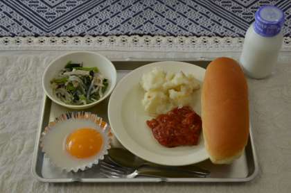22日は今年最後の給食です。メニューはショートニングパン、とり肉のチリソースかけ、青菜のソテー、ジャガイモのクリーム煮、おかしな目玉焼き、牛乳です。写真の左下が「おかしな目玉焼き」ですが・・・その正体は・・・じつは、黄身が黄桃の缶詰、白身がゼリーです。二学期最後(今年最後)の給食は、いつもより材料費をちょっとだけ奮発して、手間はいつもよりたくさんかけて、給食調理員さんががんばってつくりました。とても美味しくいただきました。