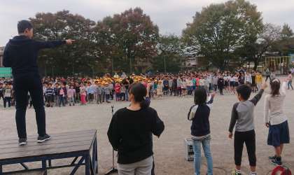 かわいいダンスをしながら、集会委員が言う動物の名前の文字数だけ、お友達を集めます。