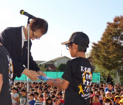 全校朝会では、9月の水泳記録会、10月の連合運動会での6年生のがんばりが紹介され、全校児童からのあたたかい拍手に包まれました。