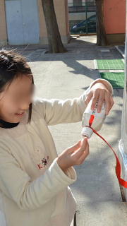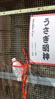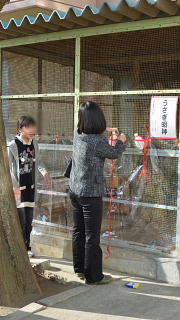 卯年にちなんで、飼育担当が飼育小屋にちょっとしたしかけを・・・。「うさぎ大明神」の看板をつけておみくじコーナーをつくりました。子どもたちに飼育動物に対する関心を高めてほしい、という担当者の願いです。さっそくおみくじをひいて、ニッコリ笑顔。