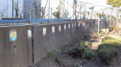 船橋地区では、青少年の健全育成を目的とした子どもぶんか村の活動が行われています。以前お知らせした音楽くらぶもその一つですが、今日紹介するのは「まち探検くらぶ」です。15日の活動で、学校東側の烏山川緑道の擁壁(本校校庭のコンクリート壁)に装飾タイルを飾り付けしました。タイルに子どもたちが動植物の絵付けをして焼き、それを貼り付けました。
