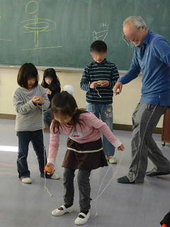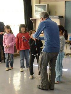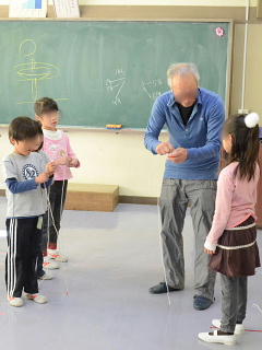 2年生は3時間目に教えていただきました。コマにひもを結ぶのが難しく、さらに手首を使ってコマを投げるのに苦労していました。「保育園の時はどうしてもできなかったけど、今日できるようになったよ」といううれしい報告がありました。写真は2年生の授業のようすです。講師の先生、お忙しいところありがとうございました。