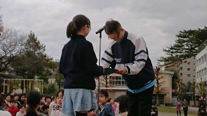 税に関する絵はがきコンクールの表彰。もうひとつは本校の児童が所属する少年野球チームの表彰も行われました。