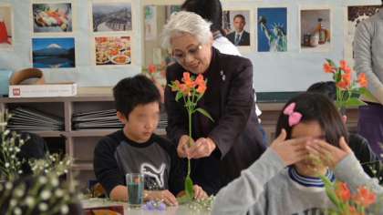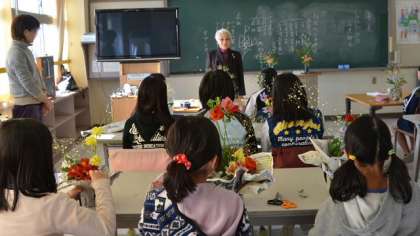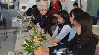 写真は「華道」のようすです。お花の生け方を本格的に教わったのは初めてという子もいて、初めは緊張していましたが、作品はかわいいウサギということで、緊張感のなかにも楽しい雰囲気がただよいました。作品ができてみんな大喜びでした。