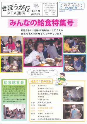 私には、希望丘小学校の自慢がいくつもあるのですが、その中の一つは、すばらしいPTA通信です。PTA広報委員会が、学校の様々な話題をタイムリーにとりあげて作成してくださっています。1月17日付けで、PTA通信「きぼうが丘」第31号「みんなの給食特集号」が発行され、保護者の皆様のお手元にとどいていることと思います。このすばらしいPTAだよりを、より広く見ていただこうと思い、このホームページにもアップしてあります。今号だけでなく、今年度のものはそちらを見ていただければ、ご覧になることができます。「PTA」のタグをクリックして開いてください。トップページの配布文書一覧をクリックしてご覧になることもできます。
