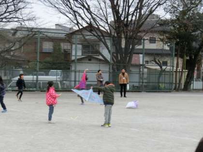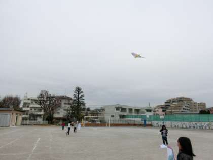 初雪がちらつくような寒い中でしたが、元気いっぱいに走り回り、たこを飛ばしていました。