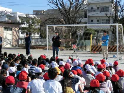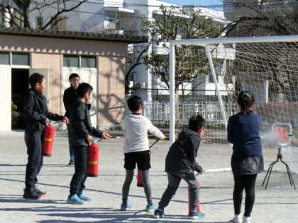 先生数人と高学年の代表児童が、水の出る消火器を使い、体験をしました。
