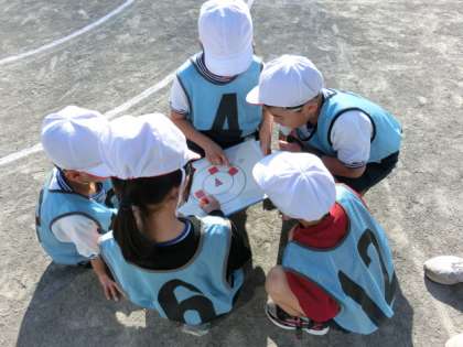 パスの練習を行ったり、ホワイトボード使用して作戦を立てたりし、ゲームに取り組みました。