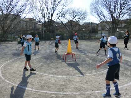 攻撃、守備に分かれて三角コーンにボールを当てるゲームを行いました。