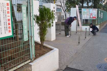 振替休業日だった24日月曜日に、正門前両側フェンスと掲示板の位置を少し動かす工事をしました。これは、正門前の歩道が狭く、学校から出る児童からは、両側から近づいてくる人や自転車が見えにくく危険だということで改良工事をしたものです。従来より少しフェンスと掲示板の位置を下げて、見通しがよくなりました。保護者や地域の方からもご意見をいただいていた懸案が解決されてほっとしています。(校長:千葉)