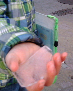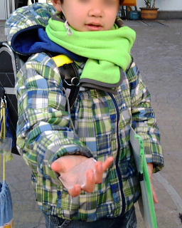毎朝正門に立ち、子どもたちをむかえあいさつしているとていると、いろいろなことがわかります。今年は連日朝夕の冷え込みが厳しく、さすがに元気な子どもたちも、北風に身をすくめながら登校してきます。27日、この日も朝はぐっと冷え込んでいました。一人の子が、大事そうになにか抱えています。分厚い氷です。手袋をしていても冷たいでしょうに、それでも子どもにとっては宝物。うれしそうに見せてくれました。