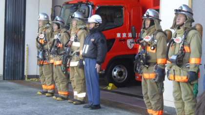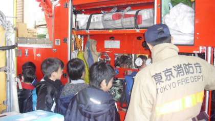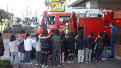3年生が社会の学習で、消防署見学に出かけました。消防車や救急車を見せてもらって説明を受けました。真剣なまなざしです。