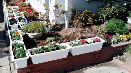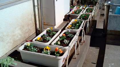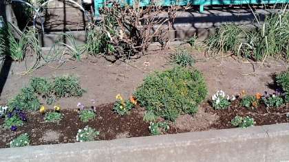 寒い日が続いていますが、昼の校舎南側は日差しがいっぱいふりそそぎ、ポカポカです。そんな中に、かわいい花々が色をそえています。ホッと心がなごみます。花にじっと見入っている子もいます。そんな様子を見ると、学校主事が寒風ふく中で一生懸命植えた甲斐があるというものです。