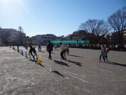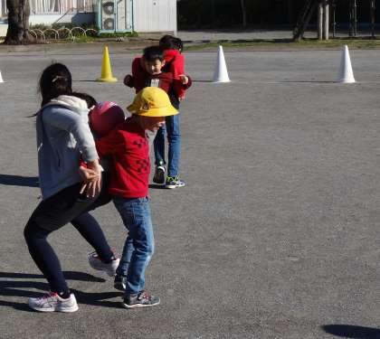 さわやかな青空の下、兄弟学年がペアとなり、希望っ子班ごとに背中にボールを挟んでリレーしていきます。